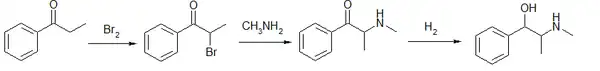 - Propiofenon reaguje z bromem dając α-bromopropiofenon, który następnie traktowany jest metyloaminą. Tak otrzymany produkt jest redukowany wodorem wobec katalizatora, którym jest pallad lub nikiel Raneya. Otrzymuje się racemiczną mieszaninę efedryny i pseudoefedryny, co jest główną wadą tej metody. Produkty rozdziela się, a ponadto pseudoefedrynę poddaje się izomeryzacji, co zwiększa wydajność efedryny.