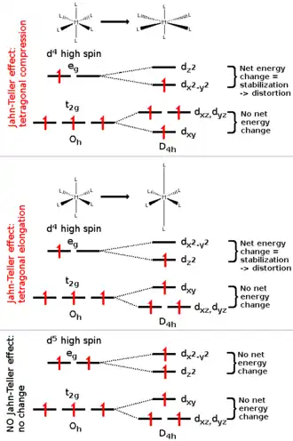 Efekt Jahna-Tellera jest najczęściej spotykany w cząsteczkach i związkach kompleksowych metali przejściowych o geometrii oktaedrycznej[2][3], tj. gdzie ligandy zajmują wierzchołki oktaedru, a atom centralny jest umieszczony na środku płaszczyzny ekwatorialnej[a] (podstawy jednego z ostrosłupów czworokątnych). Zgodnie z teorią pola krystalicznego, zdegenerowane orbitale podpowłoki d atomu centralnego w takim kompleksie ulegają rozszczepieniu na poziomy o symetrii eg oraz t2g. Efekt Jahna-Tellera pojawia się, gdy atom centralny posiada liczbę elektronów d powodującą nierównomiernie obsadzenie poziomów zdegenerowanych eg lub t2g. Zgodnie z twierdzeniem taka konfiguracja jest niestabilna, co powoduje, że oktaedryczny kompleks ulega deformacji, tj. wydłużeniu lub skróceniu wzdłuż osi czterokrotnej S4. Ze względu na liczebność orbitali eg lub t2g efekt Jahna-Tellera nie pojawia się w przypadku 3, 5 (konfiguracja wysokospinowa), 6 (niskospinowa), 8 i 10 elektronów d atomu centralnego.