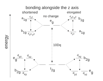 W przypadku kompleksu o konfiguracji d9, np. heksakwamiedzi(II), pojawiają się trzy elektrony na poziomie energetycznym eg. Zgodnie z twierdzeniem Jahna-Tellera dochodzi do rozszczepienia orbitali o symetrii eg i deformacji kompleksu. Zazwyczaj deformacja w tym kompleksie zachodzi w stronę oktaedru wydłużonego wzdłuż osi S4[4], orbitalem o niższej energii staje się orbital a1g (tworzony przez orbital atomowy dz²), który zostaje podwójnie obsadzony, kosztem jednego elektronu obsadzającego poziom b1g o wyższej energii. Efektywnie energia układu zostaje obniżona, ponieważ rozszczepienie energetyczne obydwu poziomów a1g i b1g zachodzi w tym samym stopniu, a podwójnie obsadzony zostaje orbital o energii niższej. Takie odkształcenie, wbrew pozorom, prowadzi do obniżenia energii elektronowej i stanowi dodatkową stabilizację kompleksu. W skrajnym przypadku kompleks może przyjąć nawet symetrię płaską kwadratową. Dzieje się tak, gdy ligandy związane wzdłuż osi S4 zostają odsunięte na nieskończenie dużą odległość od atomu centralnego.