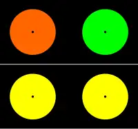 Innym przykładem, w którym obserwowany obiekt jest porównywany z obiektem występującym tym razem wcześniej, są koła znajdujące się po prawej stronie. Wystarczy wpatrywać się przez jakiś czas w środek jednego z kolorowych kół znajdujących się u góry obrazka, a następnie przenieść wzrok na odpowiadające mu żółte koło z dolnej części obrazka. Żółte koła - początkowo o tej samej barwie - teraz wydają się być innego koloru.