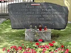 - ul. Marszałkowska 27/35 – w latach 50. na frontowej ścianie budynku odsłonięto tablicę projektu Karola Tchorka, upamiętniającą mieszkańców domów przy ul. Marszałkowskiej zamordowanych przez Niemców w pierwszych dniach sierpnia 1944[46]. W późniejszych latach zainstalowano tam jeszcze jedną tablicę, upamiętniającą rozstrzelanych w tym miejscu harcerzy z mokotowskich Szarych Szeregów.