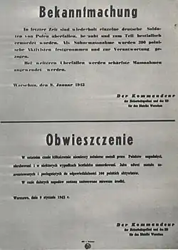 - ↑ Rozbieżność liczby odnalezionych w grobie ciał z liczbą rozstrzelanych ogłoszoną w niemieckim obwieszczeniu z 12 lutego 1943 roku wynikała najprawdopodobniej z faktu, iż zaraz po zakończeniu działań wojennych część rodzin zamordowanych dokonała „dzikiej” ekshumacji szczątków zamordowanych. Patrz: Bartoszewski 1970 ↓, s. 230.