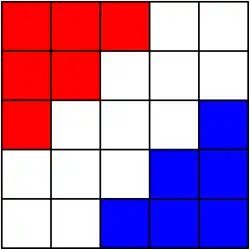 - Kamienie przesuwa się o jedno pole poziomo, pionowo lub na ukos, ale jedynie do przodu, czyli gracz czerwony (rysunek) może przesuwać kamienie tylko w prawo, do dołu lub na ukos w kierunku prawego dolnego rogu, a gracz niebieski – w lewo, do góry lub na ukos w kierunku lewego górnego rogu