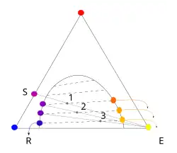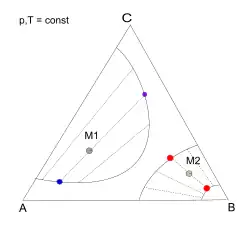 Punkty szare – skład układów dwufazowych, punkty kolorowe – skład faz, udziały faz w stanie równowagi określają długości przeciwległych odcinków, łączących składy faz ze składem układu