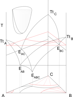 W niższej temperaturze przestrzeń współistnienia dwóch cieczy może się łączyć z przestrzenią współistnienia cieczy z fazą stałą. Mieści się ona pod powierzchniami roztworów nasyconych składnikami A, B i C. Kształt tych powierzchni zależy od rodzaju wykresów fazowych dla układów podwójnych A–B, B–C i C–A (ściany graniastosłupa). Na liniach wspólnych dla sąsiednich powierzchni nasyconych roztworów (np. nasyconych składnikami A i B) leżą punkty określające temperaturę i skład eutektyków podwójnych, zawierających trzeci składnik (np. równowaga A(BC)+B(AC)+ciecz). Układ ma jeden eutektyk potrójny, bez stopni swobody.