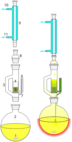 Aparat Soxhleta działa podobnie do ekspresu do kawy. Rozpuszczalnik jest ogrzewany w kolbie okrągłodennej, a pary są skraplane w umieszczonej nad nią chłodnicy wodnej. Spływając do kolby przepłukuje materiał poddawany ekstrakcji, umieszczony w gilzie ekstrakcyjnej. Wzbogaca się w ekstrahowany składnik, o większym ciężarze właściwym od rozpuszczalnika. Ekstrakt spływa do kolby, gdy poziom kondensatu w nasadce z gilzą przekroczy pozom przelewu (kolanko bocznej rurki lewarowej).