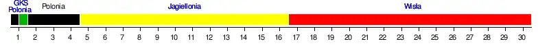 | Jagiellonia | 9 | 2 | 2 | 2 | 1 | 1 | 1 | 1 | 1 | 1 | 1 | 1 | 1 | 1 | 1 | 1 | 2 | 2 | 2 | 2 | 2 | 2 | 2 | 2 | 2 | 2 | 3 | 2 | 4 | 4 |
