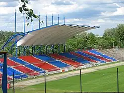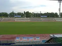 - ↑ Na czas przebudowy trybuny zachodniej pojemność stadionu ograniczona – w użytku pozostałe trybuny stadionu.