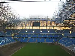 - ↑ Na czas pierwszego etapu przebudowy pojemność stadionu ograniczona – w użytku pozostawiona część trybun starego stadionu.