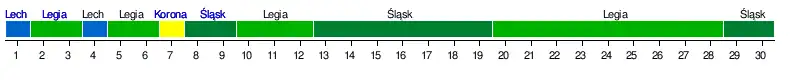 | Legia | 2 | 1 | 1 | 3 | 1 | 1 | 6 | 3 | 3 | 1 | 1 | 1 | 2 | 2 | 2 | 2 | 2 | 3 | 2 | 1 | 1 | 1 | 1 | 1 | 1 | 1 | 1 | 1 | 4 | 3 |