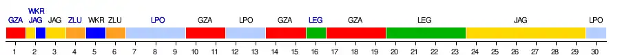 GZA – Górnik Zabrze, JAG – Jagiellonia Białystok, WKR – Wisła Kraków, ZLU – Zagłębie Lubin, LPO – Lech Poznań, LEG – Legia Warszawa