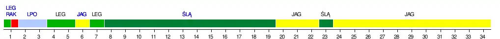 LEG – Legia Warszawa, RAK – Raków Częstochowa, LPO – Lech Poznań, JAG – Jagiellonia Białystok, ŚLĄ – Śląsk Wrocław
