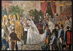 Ślub cesarza Franciszka Józefa i Elżbiety odbył się z wielkim rozmachem 24 kwietnia 1854 w kościele św. Augustyna w Wiedniu. W tym samym kościele małżeństwo zawarli wcześniej: Maria Teresa Habsburg i Franciszek I Lotaryński (w 1736), Maria Antonina Austriaczka i Ludwik XVI (w 1770) oraz Maria Ludwika Austriaczka i Napoleon Bonaparte (w 1810)[37]. W dniu ślubu Elżbieta wystąpiła w białej sukni haftowanej złotem i srebrem z długim koronkowym trenem, a całość kreacji wieńczył diadem z opali i diamentów[38]. Uroczystość zaślubin celebrował arcybiskup Wiednia, Joseph Othmar von Rauscher[39][40]. Z racji tego, że jego kazanie było nadzwyczajnie długie, zyskał przezwisko „kardynał Plauscher” (Gawędziarz)[41][42].