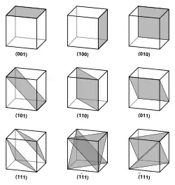 - płaszczyzny symetrii – płaszczyzny dzielące kryształ na dwie części pozostające względem siebie w takim stosunku jak przedmiot do swego obrazu w zwierciadle płaskim.