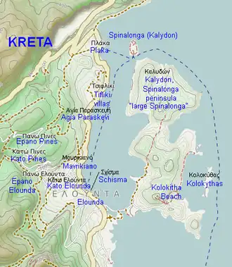 - Kalidon – Καλυδών – niezamieszkana wyspa Spinalonga, półwysep Spinalonga oraz wyspa Kolokitas