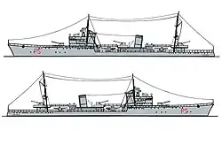Uzbrojenie główne stanowiło 6 armat kalibru 120 mm i 6 wyrzutni torped. Wyporność standardowa wynosiła początkowo 1900 ton, a ostatecznie 2125 ton. Napęd stanowiły turbiny parowe.