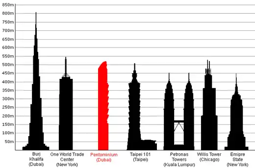 Wybrane drapacze chmur (na czerwono zaznaczono wieżowce w budowie)