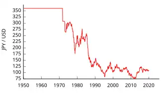 W 1917 w trakcie I wojny światowej, Japonia, jak inne kraje uczestniczące w wojnie, odeszła od systemu waluty złotej[2]. Z powodu kryzysu gospodarczego próby powrotu w latach 30. XX wieku nie powiodły się[2]. W 1949, po II wojnie światowej, bank Japonii przyjął sztywny kurs jena do dolara amerykańskiego na poziomie 360 jenów za jednego dolara – kurs ten był utrzymywany do końca 1970 roku[2]. W 1971, po porozumieniu smithsońskim (ang. Smithsonian Agreement), kurs zmieniono na 308 jenów za dolara – nowy kurs utrzymano przez dwa lata[2]. Kiedy w 1973 Stany Zjednoczone zdewaluowały dolara wobec złota, Japonia, podobnie jak i inne kraje, przyjęła płynny kurs walutowy[2]. Przez kolejne dziesięć lat, kurs jena do dolara wahał się w przedziale 296–210 jenów za dolara – wówczas termin „endaka” na trwałe wszedł do języka japońskiego[2].
