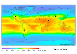 Do górnych warstw atmosfery Ziemi dociera promieniowanie słoneczne o natężeniu promieniowania 1366 W/m² (patrz stała słoneczna). Oznacza to, że całkowita moc docierająca do atmosfery wynosi około 174 petawatów. Około 30% tej mocy jest odbijane w kosmos, a kolejne 20% jest pochłaniane przez atmosferę[6][7]. Do powierzchni Ziemi dociera około 89 petawatów, co oznacza średnio około 180 W/m²[7]. Moc ta nie jest rozmieszczona równomiernie: obszar oświetlony światłem padającym prostopadle do powierzchni może otrzymać do 1000 W/m², natomiast obszary, na których trwa noc, nie otrzymują bezpośrednio nic. Po uśrednieniu cyklu dobowego i rocznego najwięcej energii otrzymują obszary przy równiku, a najmniej obszary okołobiegunowe. Sumaryczna energia, jaka dociera do powierzchni poziomej w ciągu całego roku, wynosi od 600 kWh/(m²*rok) w krajach skandynawskich do ponad 2500 kWh/m²/rok w centralnej Afryce[8]. W Polsce wynosi około 1100 kWh/(m²*rok)[9].