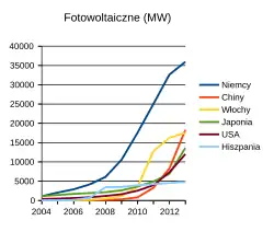 Poniższa tabela przedstawia sumaryczną moc ogniw fotowoltaicznych w poszczególnych krajach w MW[4]: