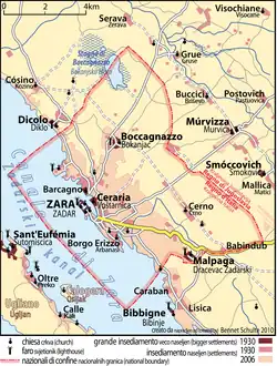 Po I wojnie światowej na podstawie Traktatu z Rapallo w 1920 roku włoską enklawą stał się Zadar wraz z kilkoma przyległymi, niewielkimi miejscowościami – w sumie zaledwie 104 km². Podczas II wojny światowej wojska niemieckie wkroczyły do Zadaru. Miasto zostało silnie zbombardowane w 1944 roku. W 31 października 1944 r., po wycofaniu wojsk niemieckich i ucieczce włoskich urzędników Zadar zajęli jugosłowiańscy partyzanci i stał się on częścią Jugosławii[2][3].