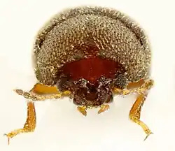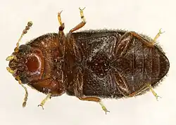 Chrząszcz o wydłużonym, walcowatym, lekko błyszczącym ciele długości od 1,4 do 2 mm. Ubarwienie ma rdzawoczerwone do rudożółtego, rzadziej ciemniejsze, zawsze z częściowo żółtawymi czułkami i odnóżami. Wierzch ciała jest wyraźnie i gęsto punktowany. Czułki zbudowane z dziewięciu członów, z których trzy ostatnie formują buławkę. Głowa samca ma dwa szerokie zęby po bokach. Przedplecze pozbawione jest długich rzęsek na krawędziach przedniej i bocznych. U samca jego przednia krawędź przedłużona jest w dwa rogi. Na pokrywach brak jest regularnych rzędów punktów, natomiast w niewyraźne, podłużne szeregi ułożone są złociście brązowo ubarwione, krótkie, chropowate, łuskowate włoski. Długość pokryw jest co najmniej półtorakrotnie większa niż ich wspólna szerokość. Golenie odnóży przedniej pary cechują się kątem zewnętrzno-wierzchołkowym ostrym lub przedłużonym w ząbek[3].