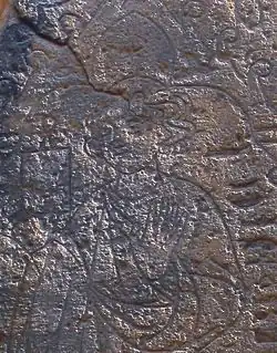 Płyta przedstawia postać duchownego, lewą ręką błogosławiącego, natomiast w prawej ręce trzymającego księgę, na której stoi rzekoma klepsydra. Przy głowie duchownego znajdują się trzy łukowate motywy przypominające płatki kwiatów. Wyryte symbole miałyby oznaczać: księga – ludzkie życie lub wiedzę, klepsydra – czas lub grawitację, łukowate motywy – myśl lub intencję, lewa ręka – błogosławieństwo lub moc płynącą z wiedzy[3].
