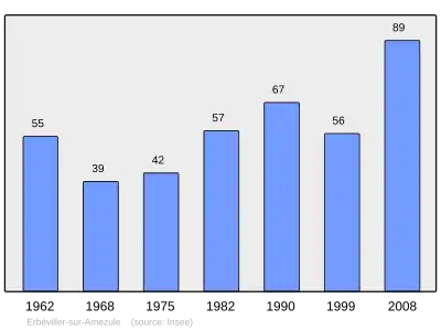 Według danych na rok 1990 gminę zamieszkiwało 67 osób, a gęstość zaludnienia wynosiła 15 osób/km² (wśród 2335 gmin Lotaryngii Erbéviller-sur-Amezule plasuje się na 978. miejscu pod względem liczby ludności, natomiast pod względem powierzchni na miejscu 1057.).