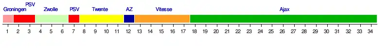 | 1 | Ajax (M) | 34 | 20 | 11 | 3 | 69 | 28 | +41 | 71 | Liga Mistrzów UEFA • Faza grupowa |