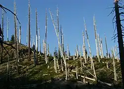 - obszar spalony, zewnętrzny rejon dotknięty wybuchem. Drzewa nie zostały złamane, jednak były spalone przez gaz osiągający temperaturę kilkuset stopni[15]. Nazwa tej strefy brzmiała standing dead zone („strefa stojących martwych drzew”).
