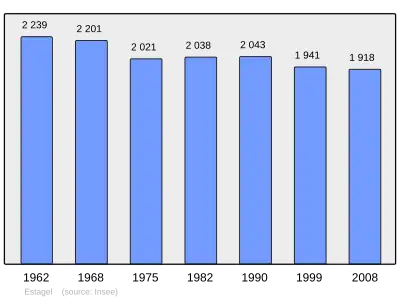 Według danych na rok 1990 gminę zamieszkiwały 2043 osoby, a gęstość zaludnienia wynosiła 98 osób/km² (wśród 1545 gmin Langwedocji-Roussillon Estagel plasuje się na 192. miejscu pod względem liczby ludności, natomiast pod względem powierzchni na miejscu 359.).