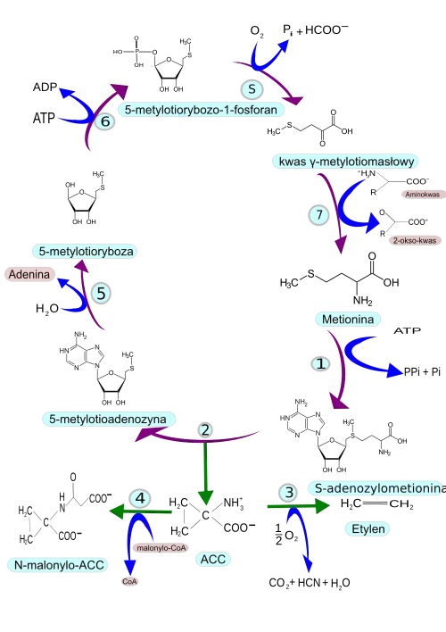 - ↑ S.F. Yang, N.E. Hoffman, Ethylene Biosynthesis and its Regulation in Higher Plants, „Annual Review of Plant Physiology”, 35 (1), 1984, s. 155–189, DOI: 10.1146/annurev.pp.35.060184.001103 [dostęp 2024-11-06] (ang.).