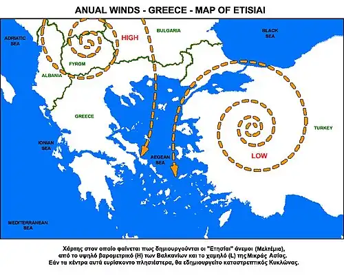 Wiatry etezyjskie są związane z gradientem ciśnienia pomiędzy wyżem nad Bałkanami (prawoskrętna cyrkulacja) i niżem nad Turcją (lewoskrętna cyrkulacja monsunowa), co najlepiej widać na mapce. Etezje są przykładem wiatru katabatycznego.