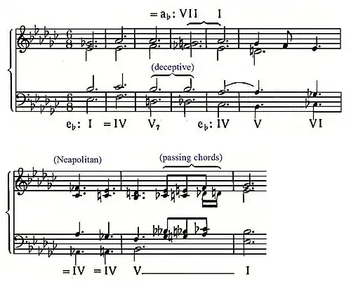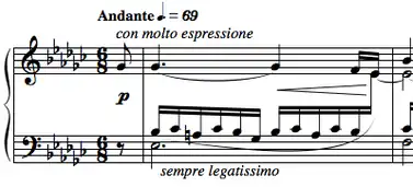 Niemiecki muzykolog Hugo Leichtentritt (1874–1951) opisuje trzy- i momentami czterogłosową fakturę jako „melodię bolesnej, elegijnej ekspresji ponad powolnym, prawie ospałym basem, pomiędzy nimi kręty [szesnastkowy] głos środkowy, który pomimo swojego wąskiego ambitusu dodaje wielkiego wewnętrznego wzburzenia”[4]. Cechą charakterystyczną melodii jest wykorzystanie chromatycznych dźwięków pobocznych na mocną miarę osiąganych ruchem skokowym (saltus duriusculus)[5].