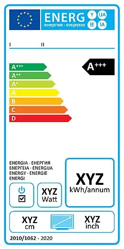 Wzór i zasady etykietowania dla telewizorów i monitorów określa unijne rozporządzenie delegowane Komisji (UE) 2021/340 z dnia 17 grudnia 2020 r[9]. Na etykiecie energetycznej widnieje skala od A do G (7 klas) zależnych od EEI. Klasy efektywności energetycznej dla wyświetlaczy elektronicznych: