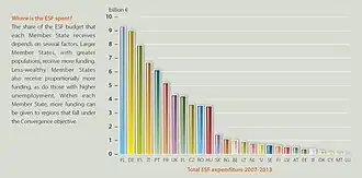 Wykres nr 2 ilustruje wysokość wydatków EFS przypadających na każde państwo członkowskie, w okresie 2007-2013. Redystrybucyjny charakter EFS ilustruje wykres nr 3, przedstawiający wydatki na jedną osobę w każdym z państw członkowskich.