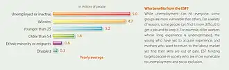 Podobnie zróżnicowani są także ostateczni beneficjenci projektów EFS, na przykład: indywidualni pracownicy, grupy ludzi, sektory przemysłu, związki zawodowe, jednostki administracji państwowej czy też indywidualne firmy. Odrębną grupą docelową są środowiska szczególnie narażone. Dotyczy to ludzi, którzy mają trudności ze znalezieniem pracy lub z otrzymaniem awansu, jak na przykład osoby długotrwale bezrobotne czy kobiety. Warto zaznaczyć, iż ocenia się, że co roku ponad 9 milionów ludzi z grup narażonych otrzymuje pomoc dzięki uczestnictwu w projektach finansowanych z EFS – patrz wykres nr 1.