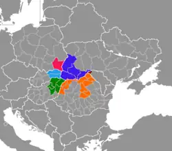 - Ukraina: po stronie ukraińskiej w skład Euroregionu wchodzą 4 obwody: lwowski, zakarpacki, iwanofrankiwski i czerniowiecki. Ukraińska część Euroregionu ma 56 600 km² powierzchni i liczy 6430 tys. mieszkańców.