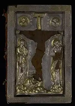 Okładka przednia, wykonana w stylu bizantyńskim, przedstawia ukrzyżowanie Jezusa Chrystusa ze stojącymi postaciami Marii i św. Jana oraz klęczącą postacią kobiety, być może samej Anastazji[6]. W górnych rogach umieszczone są okrągłe w medaliony z symbolem słońca i napisem „sol” oraz wyobrażeniem księżyca i napisem „luna”[3][6].
