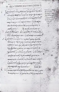 - ↑ Amphilochy, Archimandrit, Paläographische Beschreibung datirter griechischer Handschriften des IX und X Jahrhunderts, mit 26 zweifarbigen Tafeln Schriftproben, trans. Oscar von Gebhardt, Theologische Literaturzeitung. Leipzig 1881, p. 129.