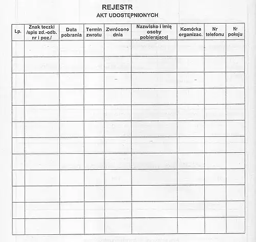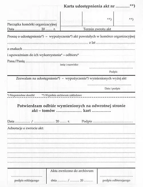 Składają się na nią rejestr akt udostępnionych oraz karty udostępnienia akt. Karty układane i wpisywane są do rejestru chronologicznie według dat udostępnienia. Obowiązkiem archiwisty jest wystąpić, najpóźniej na koniec roku, do wypożyczającego o zwrot akt do archiwum.