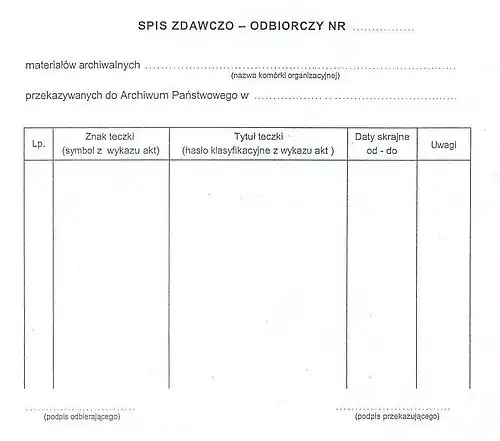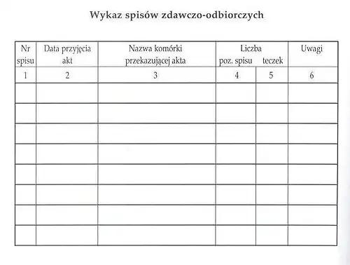 Przy sporządzaniu spisu zdawczo-odbiorczego dokumentacji należy przestrzegać zasady, aby nie umieszczać razem na jednym spisie dokumentacji o różnych okresach przechowywania oraz starać się umieszczać jednostkę archiwalną jako osobną pozycję na spisie (rubryka nr 6); przy dużych ilościach dokumentacji przejmowanej np. z komórki finansowej pozwala to na zachowanie kontroli nad przejmowaną dokumentacją.