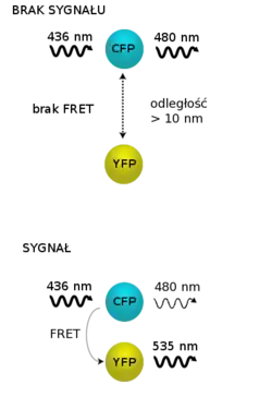 Chromofor-donor, będąc w stanie wzbudzonym, może przekazywać energię wzbudzenia chromoforowi-akceptorowi znajdującemu się w odległości nie większej niż ok. 10 nm. Jeśli donor i akceptor różnią się widmami absorpcji i emisji promieniowania, a znajdują się w odległości mniejszej niż 10 nm, to wzbudzając donor wiązką o długości fali odpowiadającej maksimum jego absorpcji, obserwuje się emisję fali o długości odpowiadającej maksimum emisji akceptora. Jeśli odległość między donorem a akceptorem jest większa, przekazanie energii nie zachodzi i obserwuje się jedynie emisję fali przez donor z charakterystycznym dla niego maksimum emisji.