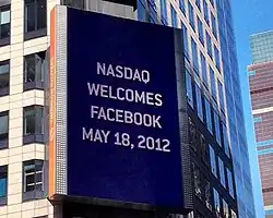W maju 2012 roku zapowiedziano uruchomienie sklepu z aplikacjami, jako odpowiedź na rosnące użycie smartfonów[77]. 17 maja 2012 roku Facebook zaprezentował pierwszą ofertę publiczną, w której każda akcja kosztowała 38 dolarów[78], wyceniając całą spółkę na 104 miliardy dolarów[79]. Pierwszy dzień na giełdzie przyniósł przychody w wysokości 16 miliardów dolarów[79]. W ciągu pierwszego dnia na giełdzie wartość akcji wzrosła do 45 dolarów, a potem przez kolejne kilka miesięcy stopniowo spadała, osiągając we wrześniu 2012 roku poziom 17,73 USD[78]. 1 października 2012 roku Mark Zuckerberg odwiedził Rosję, spotykając się z premierem Dmitrijem Miedwiediewem, żeby wzmocnić pozycję Facebooka na rynku rosyjskim[80]. 4 października 2012 roku Facebook ogłosił przekroczenie progu 1 miliarda aktywnych użytkowników na platformie[81].
