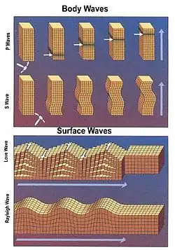 - fale podłużne (undae primae, P, dylatacyjne) – podczas przechodzenia tych fal materia drga w kierunku równoległym do kierunku rozchodzenia się fal; powodują ściskanie i rozciąganie skał, przez które przechodzą; mogą rozchodzić się również w płynach, w tym także w płynnym jądrze Ziemi. Fale P są najszybsze z fal sejsmicznych (stąd nazwa undae primae). Prędkość fal P wyraża się wzorem: VP=((λ + 2μ)/d)1/2 gdzie λ i μ oznaczają stałe sprężystości Lamégo, a d gęstość, czyli masę właściwą[1]. Prędkość fal P generalnie zwiększa się z głębokością od około 2 do 8 km/s w skorupie Ziemi aż do około 13 km/s na granicy z jądrem. W skorupie i górnym płaszczu Ziemi występują jednak warstwy z mniejszą prędkością fal (np. astenosfera).
