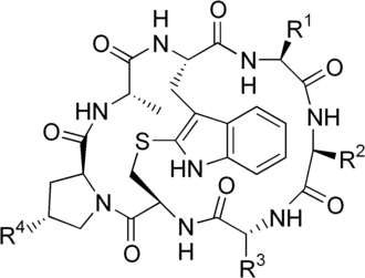 Są to cykliczne oligopeptydy, zbudowane z siedmiu reszt aminokwasowych (o konfiguracji D i L), spiętych dodatkowym łącznikiem zawierającym grupę indolową i mostek siarkowy. Mają budowę zbliżoną do amanitotoksyn, dłuższych od fallotoksyn o jedną resztę aminokwasową.