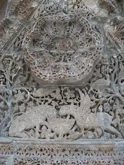 Po lewej stronie fasady, ornamentyka indywidualnych pól nawiązuje do motywów latorośli i winogron. Spomiędzy roślin wyłaniają się postaci zwierząt oraz stworzeń mitycznych m.in. gryfów, simurgów i centaurów. Latorośle wyrastają ponad plintę, przecinając poskręcane liście akantu, i biegną ruchem spiralnym przez całą powierzchnię ściany aż do apeksu. Na ich pędach siedzą ptaki dziobiące owoce winorośli. Motywem dominującym trójkątne pola jest para naturalistycznie przedstawionych zwierząt pijących wodę z jednego naczynia. Często są to, ukazane obok siebie, lwy i woły – motyw zaczerpnięty ze sztuki wczesnego chrześcijaństwa bizantyjskiego- symbol niebiańskiego pokoju. Świat przedstawiony na reliefach fasady przywołuje na myśl rajski ogród.