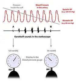 - faza I - rozpoczyna się wraz z pierwszym usłyszanym tonem podczas wykonywania pomiaru, wtedy też odczytuje się wartość ciśnienia skurczowego