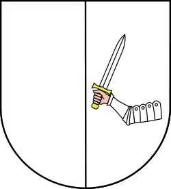 Na tarczy dzielonej w słup w polu prawym nieznany herb rodowy, w polu lewym, ramię zbrojne.