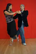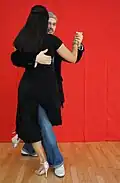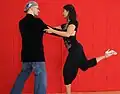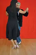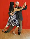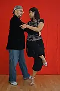 | Volcada | Volcada | Figura z wychyleniem partnerki od osi, w której kobieta jest odchylona do przodu i wykonuje nogami ocha lub ozdobniki. Volcady mogą być wykonywane w bliskim lub otwartym trzymaniu. W przypadku bliskiego trzymania równowaga jest utrzymywana za pomocą ciała prowadzącego. W przypadku volcady w otwartym trzymaniu mężczyzna podtrzymuje kobietę za pomocą ramion (prowadząca naciska swoje ramię w dół). Patrz także apile. | ![]() |